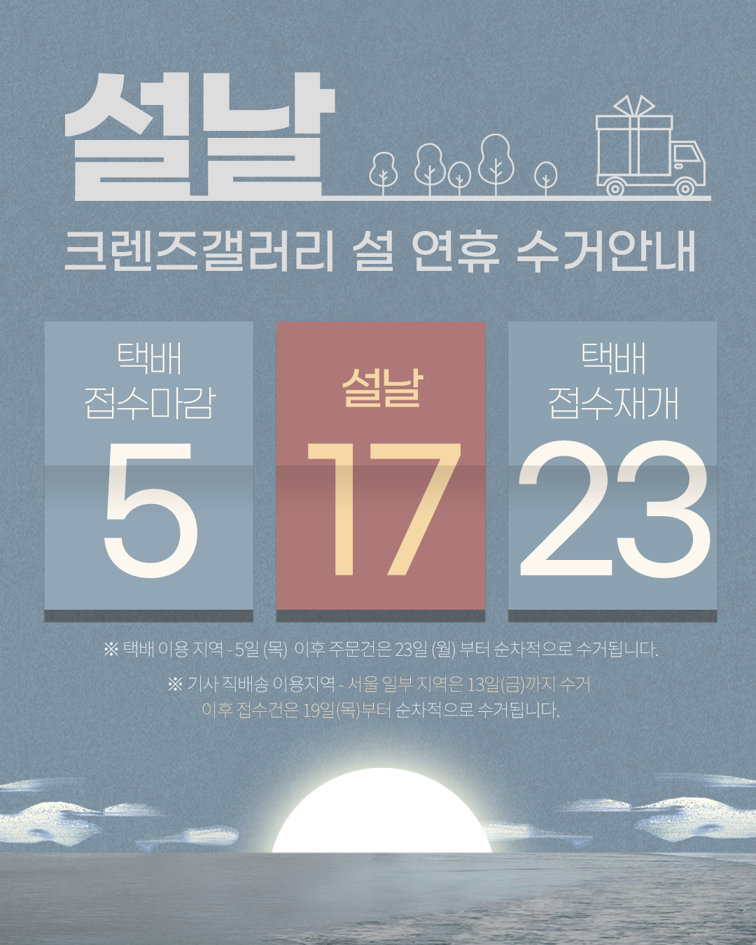 안녕하세요, 크렌즈갤러리입니다. 설날 연휴 기간으로 인한 택배 사전 접수 마감으로 크렌즈갤러리 온라인(택배) 서비스는 다음과 같이 운영됩니다. - 서울 일부지역 (기사 직배송)은 2월 13일 오후1시 이후 접수건 부터 2월 19일 에 수거됩니다.