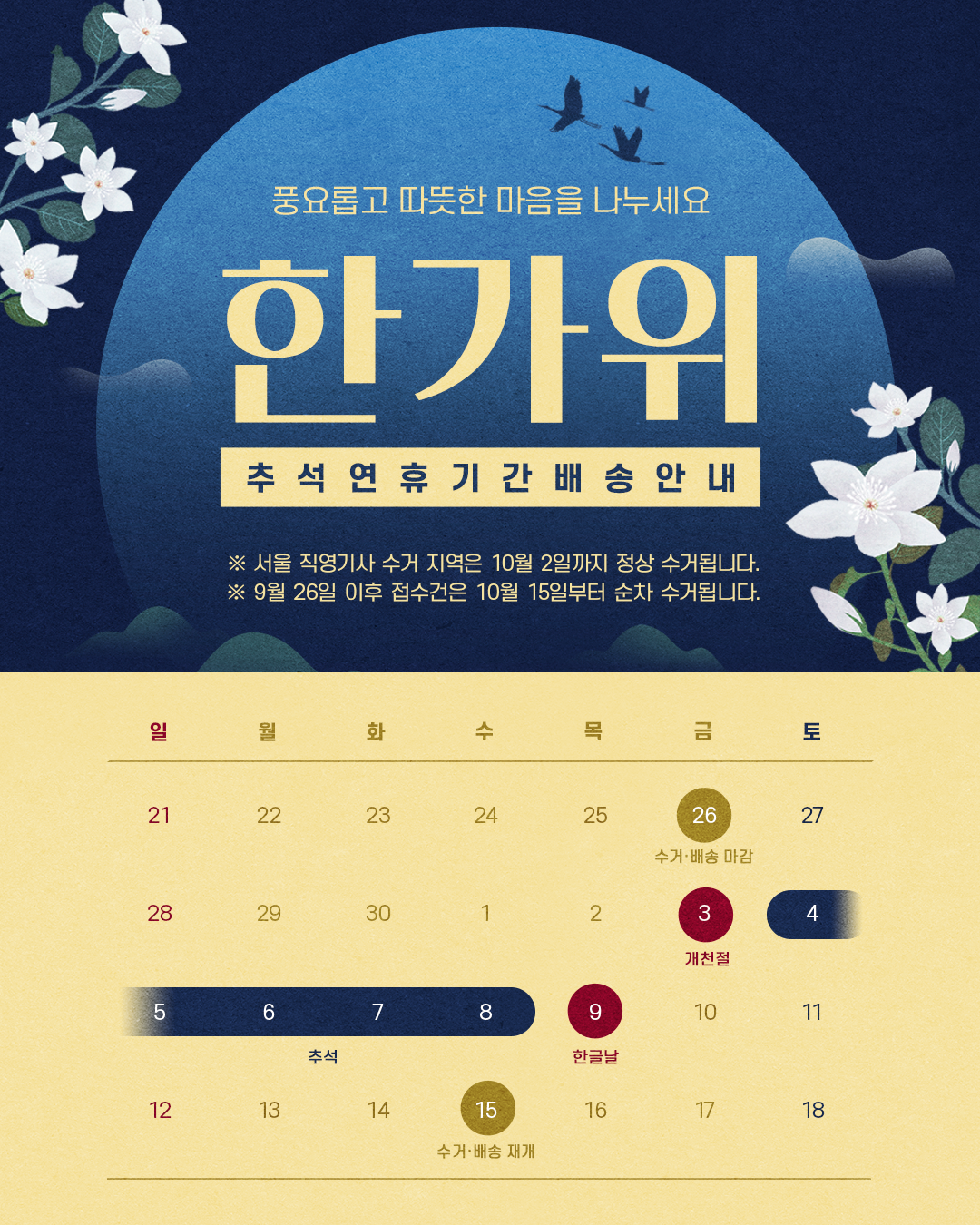 추석 연휴 기간으로 인한 택배 사전 접수 마감으로 크렌즈갤러리 온라인 (택배) 서비스는 다음과 같이 운영됩니다. - 서울 일부지역 (기사 직배송)은 10월 2일 오후1시 이후 접수건 부터 10월 10일 수거됩니다.